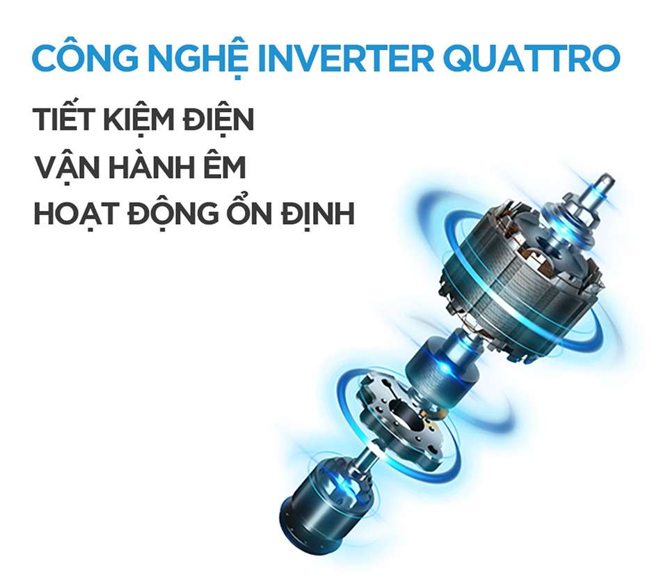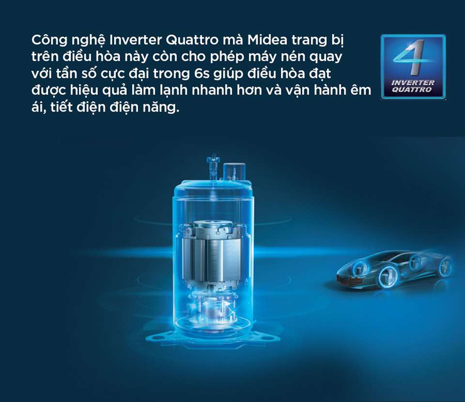 Công nghệ Inverter Quattro là giải pháp tiên tiến được Midea phát triển, giúp máy lạnh hoạt động hiệu quả như một siêu xe thể thao, mang lại hiệu suất làm lạnh cao nhất nhưng vẫn đảm bảo mức tiêu thụ năng lượng thấp nhất. Công nghệ này được thiết kế để tối ưu hóa hiệu suất hoạt động của máy nén, mang lại trải nghiệm sử dụng tốt hơn cho người dùng