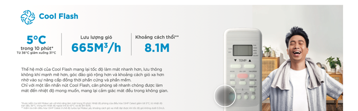 Công nghệ Cool Flash trên máy lạnh Midea Celest Inverter là một tính năng nổi bật, giúp làm lạnh siêu tốc, đưa nhiệt độ phòng xuống mức 5°C chỉ trong 10 phút. Khi kích hoạt chế độ này, máy nén Inverter hoạt động với công suất tối đa, tạo ra luồng gió mạnh mẽ và liên tục, mang lại cảm giác mát lạnh tức thì, đặc biệt hữu ích trong những ngày nắng nóng oi bức.