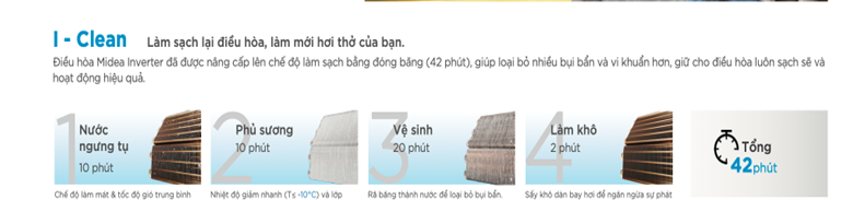 Công nghệ Clean trên máy lạnh Midea Celest Inverter là tính năng tự động làm sạch, giúp loại bỏ bụi bẩn và vi khuẩn, đảm bảo không gian luôn trong lành.