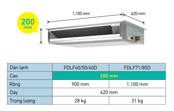 Điều hòa giấu trần nối ống gió áp suất tĩnh thấp Inverter Daikin dòng FDLF – chiều cao nhỏ gọn chỉ 200mm