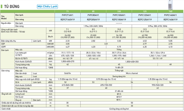 THÔNG SỐ KỸ THUẬT MÁY LẠNH TỦ ĐỨNG ĐẶT SÀN INVERTER DAIKIN FVFC